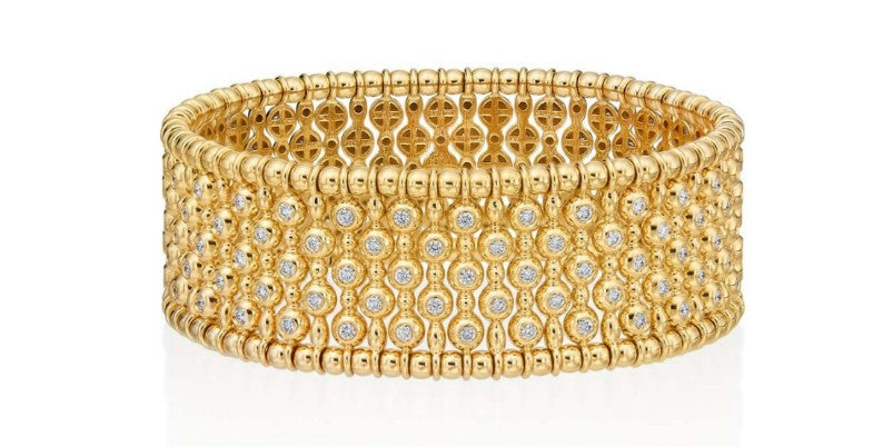Stretch Bracelet, like no other! 18k Yellow Gold Hulchi Belluni Wide Diamond Stretch Bracelet, 150 Bezel Set Diamonds, G/VS-SI, 2.25cttw